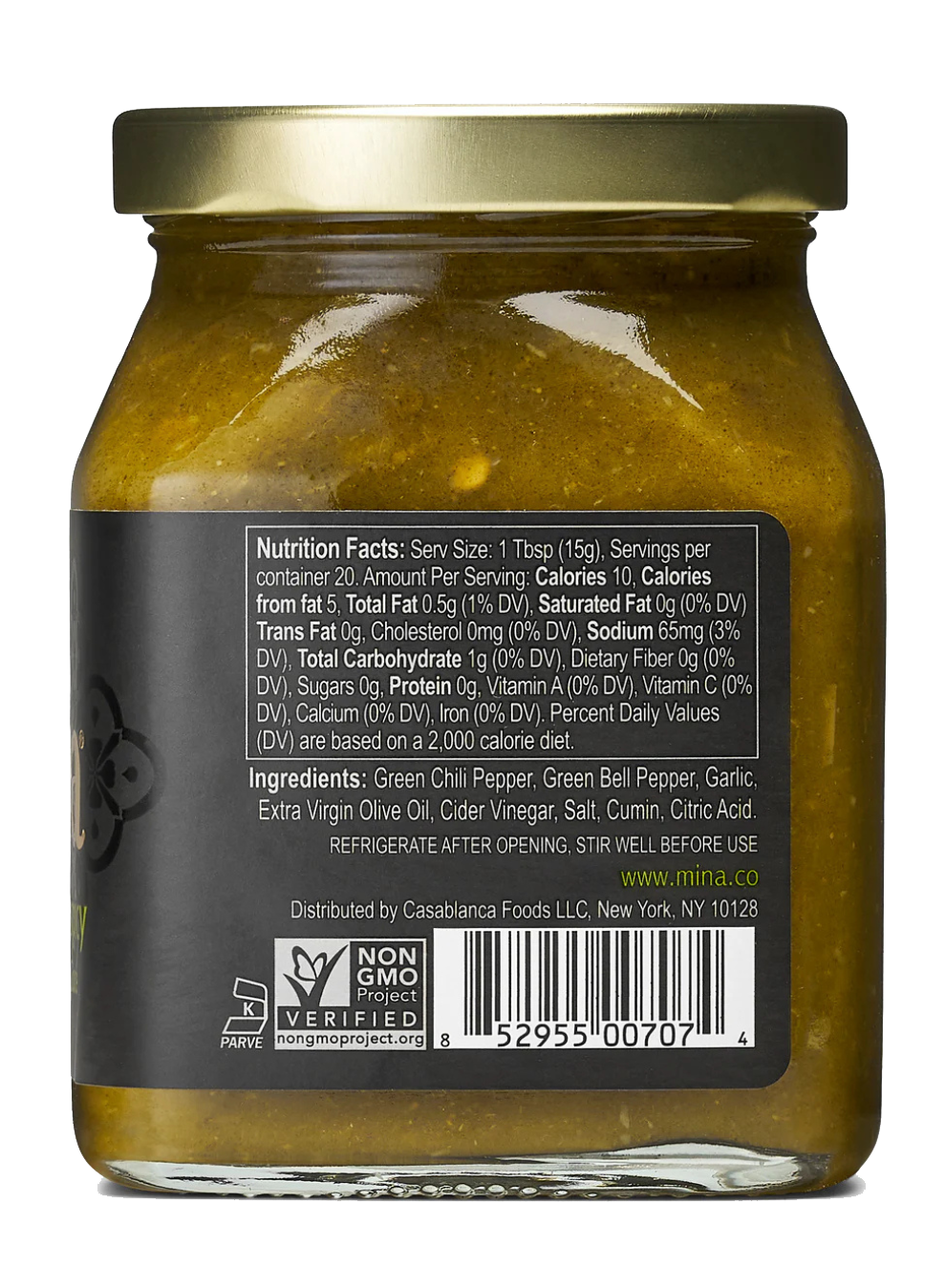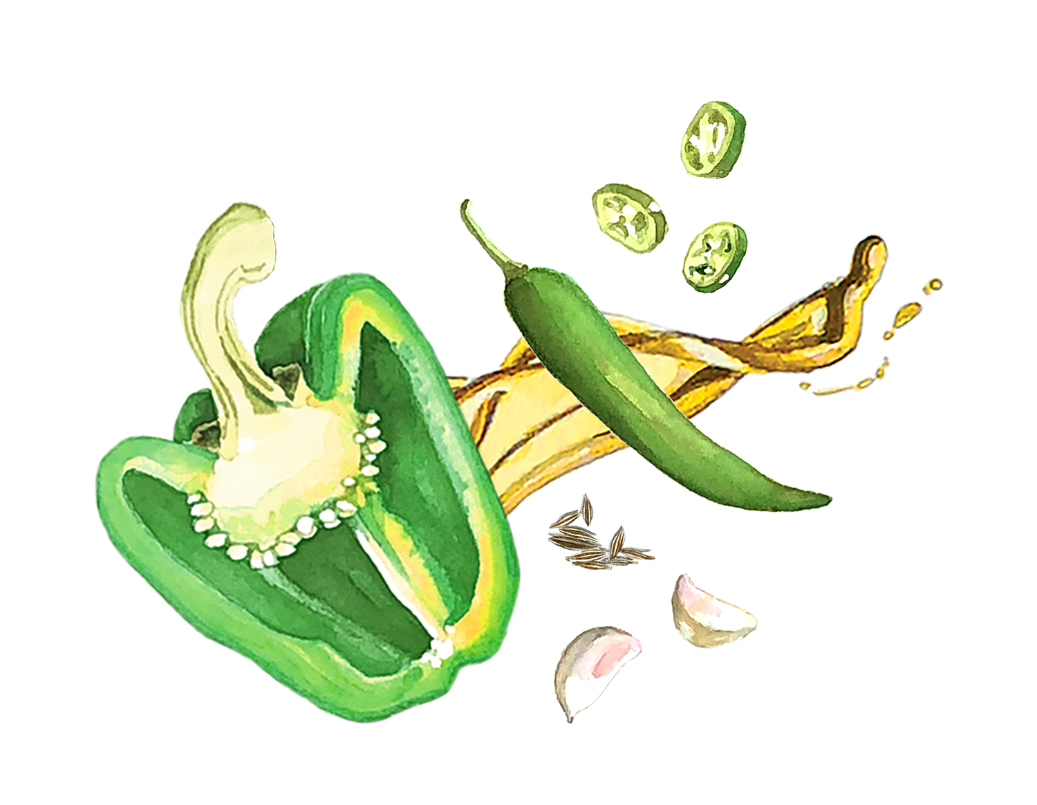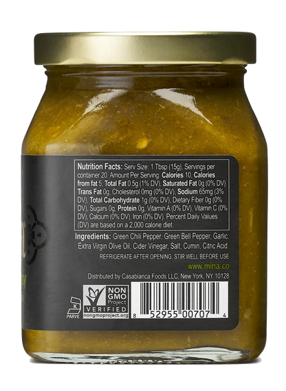 Green Chili Pepper, Green Bell Pepper, Garlic, Extra Virgin Olive Oil, Vinegar, Salt, Cumin