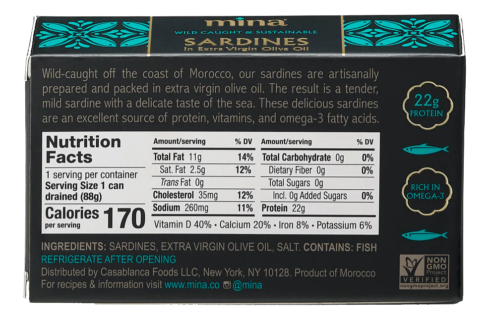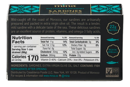 Wild-caught off the coast of Morocco where the best sardines in the world are found, ours are artisanally prepared and hand-packed fresh from the ocean with extra virgin olive oil and a touch of sea salt. The result is a tender, mild sardine with a delicate taste of the sea. These delicious sardines are an excellent source of protein, vitamins, and omega-3 fatty acids.