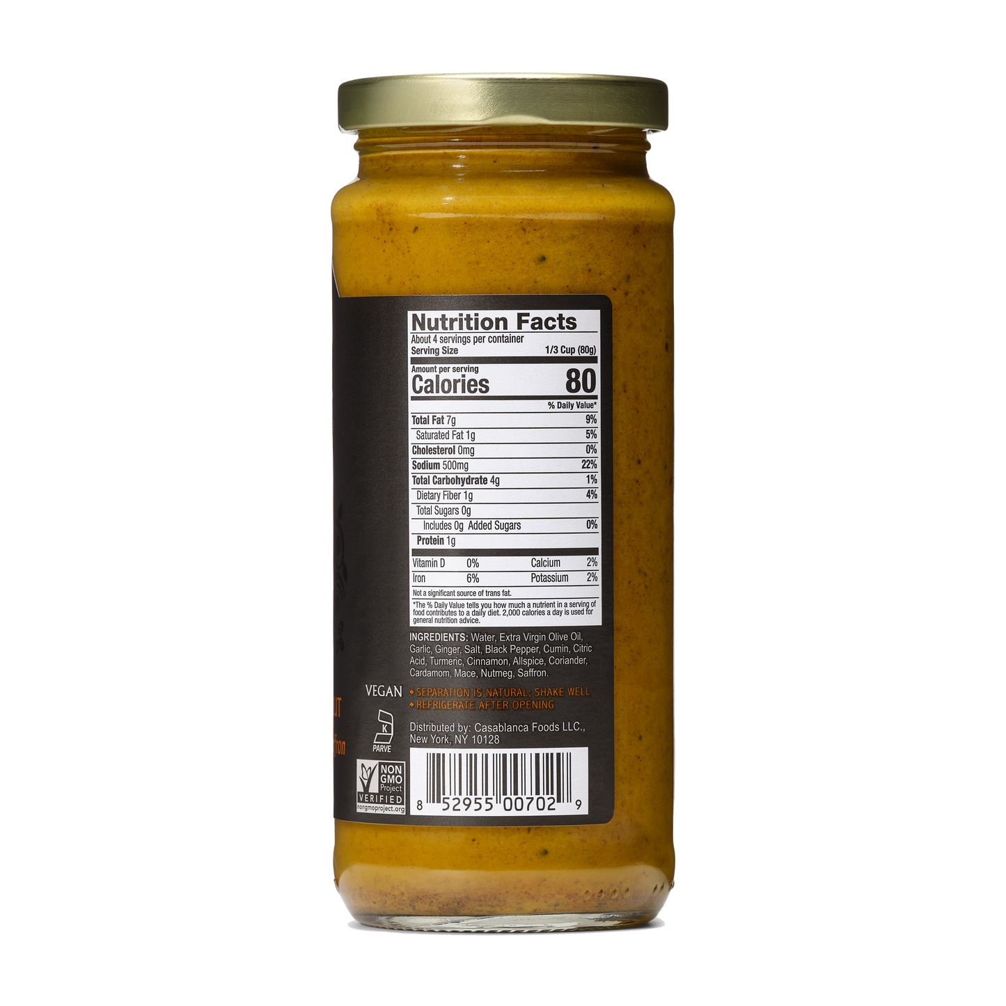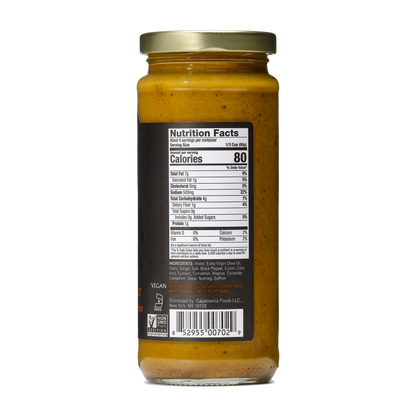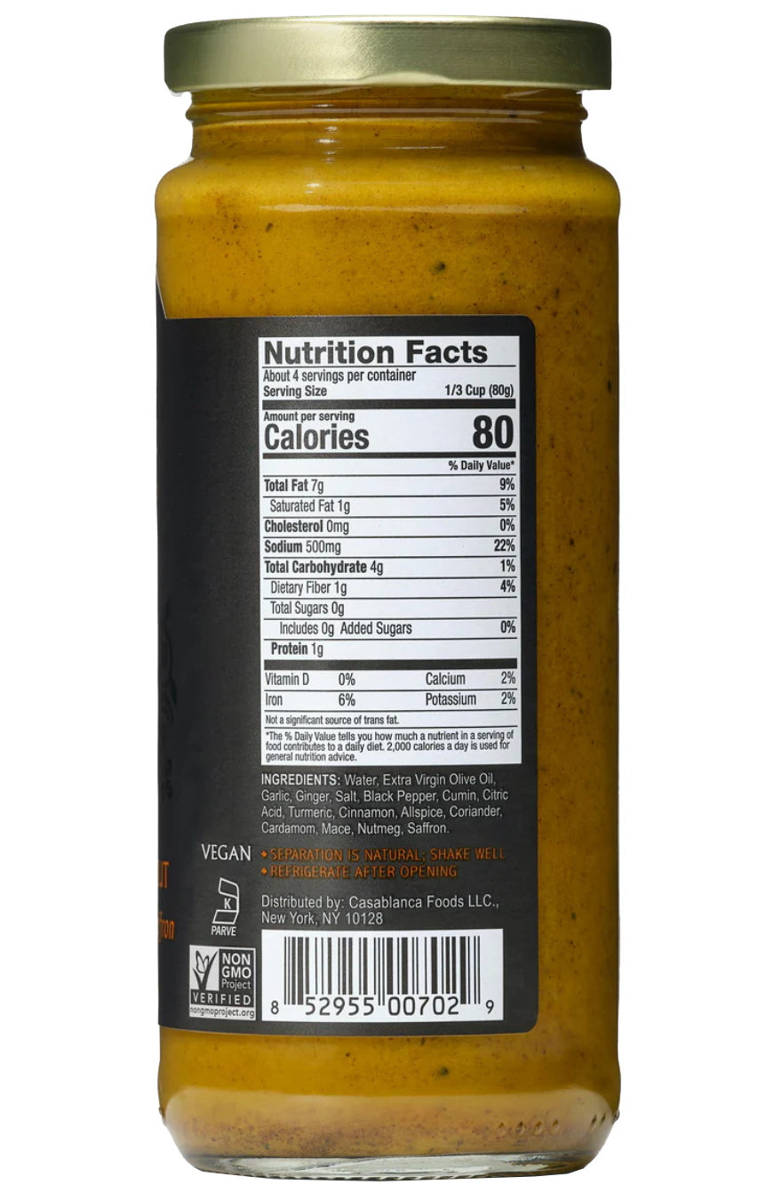 Water, Extra Virgin Olive Oil, Garlic, Ginger, Salt, Black Pepper, Cumin, Citric Acid, Turmeric,Cinnamon, Allspice, Coriander, Cardamom, Mace, Nutmeg, Saffron