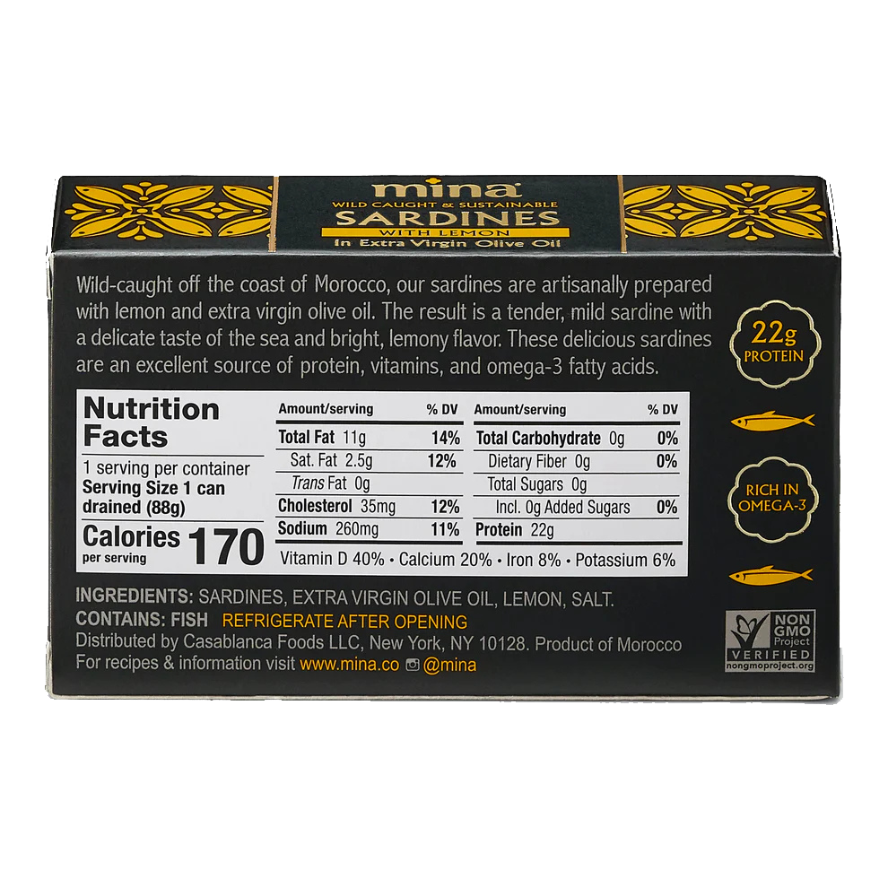 Wild-caught off the coast of Morocco, our sardines are artisanally prepared with lemon and extra virgin olive oil. The result is a tender, mild sardine with a delicate taste of the sea and bright, lemony flavor. These delicious sardines are an excellent source of protein, vitamins, and omega-3 fatty acids.